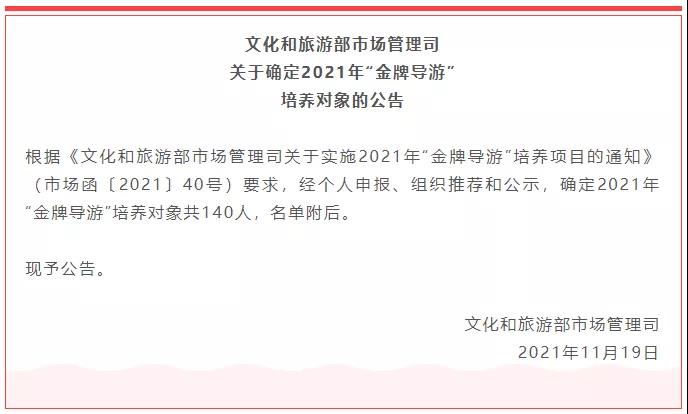 “金牌導(dǎo)游”培養(yǎng)項(xiàng)目是文化和旅游部加強(qiáng)導(dǎo)游隊(duì)伍建設(shè)的重要舉措,旨在通過(guò)加大對(duì)一線優(yōu)秀導(dǎo)游的培養(yǎng)與支持,鼓勵(lì)入選對(duì)象開(kāi)展業(yè)務(wù)研究和實(shí)踐,以點(diǎn)帶面、示范引領(lǐng)提高導(dǎo)游隊(duì)伍專業(yè)素養(yǎng),提升旅游服務(wù)質(zhì)量發(fā)揮積極作用。