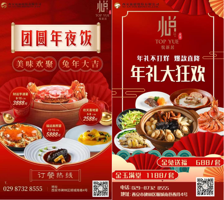旗下鉑金萬澳·勝利飯店還迎新推出“年年有余”“瑞兔呈祥”“良辰美景”“闔家歡樂”四款精品年夜飯;悅新居民宿充分利用自身餐飲屬性,推出賦有淮揚(yáng)特色的“歡天喜地”“財(cái)運(yùn)亨通”“福運(yùn)高照”三款年夜飯及“金兔送福商務(wù)禮盒”和“金玉滿堂福氣禮盒”兩款高端年貨禮盒,多元化營銷方式為市民提供迎新選擇。
