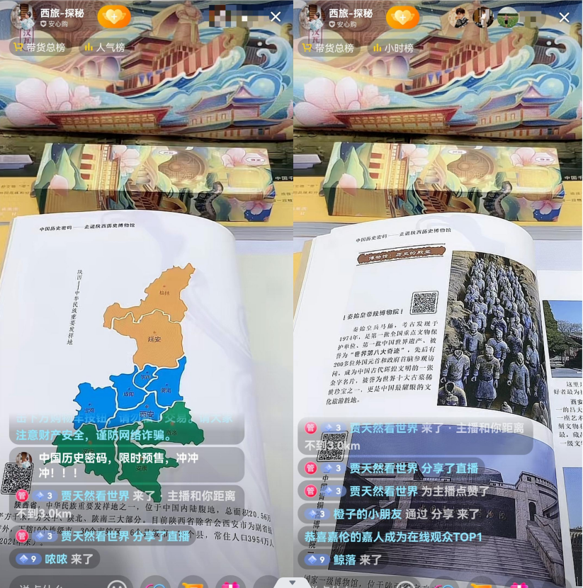 西旅直播在假日期間有針對(duì)性對(duì)《中國歷史密碼》數(shù)字文創(chuàng)讀物套裝進(jìn)行3場直播活動(dòng),通過直播有效宣傳產(chǎn)品,輸出展示三秦大地厚重而悠遠(yuǎn)的歷史文化。